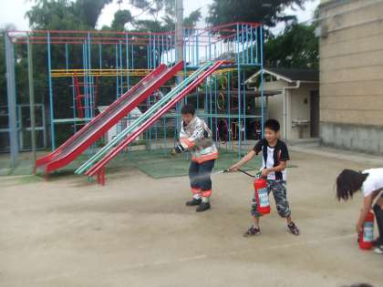 運動場では,消火器の使い方を教えていただき,実際に使わせていただきました。いざ!というとき,使い方がわからずに焦って失敗しないように・・・・