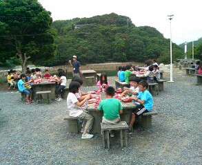 子ども達は,みんな元気で,野外の涼しい風を受けながら朝食をいただきました。