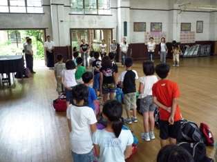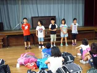 4時半過ぎ,ちょっぴり疲れた様子でしたが,子ども達は,元気に学校に帰ってきました。おうちの方もたくさん出迎えてくださいました。講堂に集まって,最後の活動の解散式をしました。最初に,出迎えてくださった保護者の方や教職員の方に,みんなで元気に帰ってきた挨拶をしました。次に,3日間お世話になった校長先生や養護の先生からお話を聞きました。そして,5人のお友達が代表して,3日間の活動報告をしてくれました。「磯で,カニを捕まえました」「ファイアーが良かったです」「肝試しは,ちょっと怖かったけど楽しかった」「夜に,夏の大三角の星が見えたことが良かった」など,3日間の活動から心に残ったことを話してくれました。