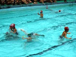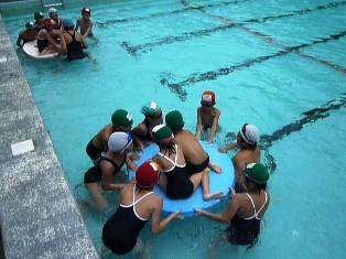 丸ビート板競争では,低学年の子どもをビート版から落とさないように,みんなで協力して運びました。対抗リレー競泳では,各学年の代表の子どもが,一生懸命泳いでリレーをしました。ご石拾いでは,低学年,中学年,高学年別に競技を行い,プールにまかれたご石も,あっと言う間になくなってしまいました。
