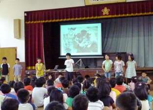 7月20日(火)。今日は,夏休み前の最後の日。朝の全校集会で,4年生は,清水タイムの発表をしました。今回の発表は,先日行ってきたみさきの家宿泊学習の思い出を発表しました。自分達の心に残った活動について,スライドを見てもらいながら発表しました。「1日目の夜に見た星空はとても綺麗だったよ」「麦崎での磯観察で,カニをつかまえたよ」「マリンランドでは,初めてペンギンを触って楽しかったよ」など,楽しかった思い出をみんなの前で発表しました。