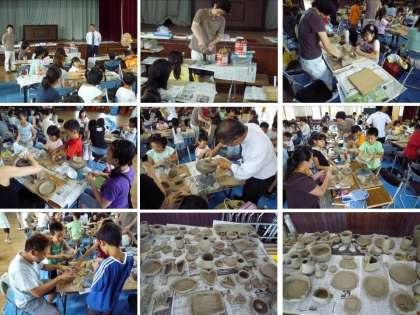 夏休みに入って2日目の今日も,朝から,夏の太陽が照りつける暑い1日となりました。そんな暑さにも負けず,親子陶芸教室にたくさんの方々がご参加されました。初めに,今年もお世話になった陶芸家の河合先生に,基本的な陶器の作り方である「紐作り」と「板作り」の方法を教えていただきました。その後,自分の思い思いの作品づくりに取りかかりました。毎年,参加されている方や,何度も陶芸を経験されておられる方も大勢いらっしゃり,楽しい作品がたくさん出来上がりました。親子で作品を作っておられる様子は,とてもほほえましく感じられました。参加者のみなさんは,自分の作品が焼きあがる日をとても楽しみにされていました。