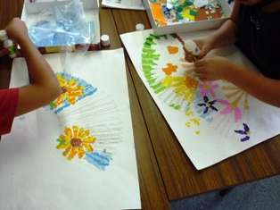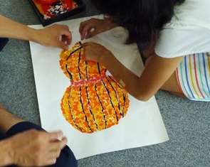 小学校の作品は,京都や東山に関係したものを,ちぎり絵にして表すことになっています。縦割りグループごとに分かれて,京野菜や茶道具,京扇子,竹細工などの作品を,縦割りグループごとに作っています。夏休みの「のびのび学習」の時間も使って仕上げに取り組み,素敵な作品ができあがってきました。