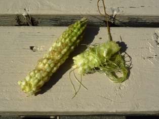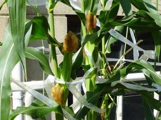 ところが,今日,見てみると,せっかく育ってきていた実だけが,無残にもカラスに食べられていたのです。とても悔しいです。これ以上カラスに食べられないように,早速,トウモロコシの周りにロープをはってみました。これで,カラスの被害を免れればいいのになと思います。