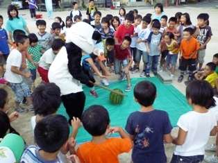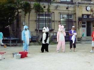 最初のプログラムは,スイカ割です。スイカ割のために,3匹の動物たちが駆けつけてくれました。ゾウさん,パンダくん,ウサギさんです。ゾウさんも,パンダさんも,そして,ウサギさんも,残念ながらスイカを割ることができませんでした。そこで,お世話になった地域のSさんやPTA会長さん,副会長さんと,次々に挑戦していただいて,ようやくスイカを割ることができました。このスイカは,後で,みんなでいただきます。