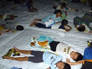 恐かったナイトハイクが終わると,もう,すっかり夜も遅くなっていました。1日目のプログラムはこれで終わりです。寝る準備をして,さあ,就寝です。和室と多目的室に別れて,全校みんなで一緒に寝ました。これも,子ども達にとっては大きな楽しみの一つ。みんな,消灯になってもなかなか寝ないでいつまでもワイワイガヤガヤ。夜中の12時ごろになって,ようやく寝静まりました。今日の楽しかった思い出を夢に見ながら寝ていたのでしょうか?