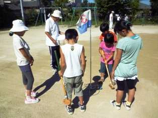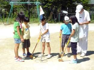 グラウンドゴルフでは,緑寿会の皆さんにお世話になりました。いつものグラウンドゴルフ大会では個人戦で勝負を競うのですが,今回は,チーム戦で勝負をしました。決められた打順に球を打っていきました。最初は,戸惑っていた子どもたちや,初めて経験する子どもたちもいましたが,それでも,バーディーやホールインワンも飛び出しました。今日も,とても暑い中でしたが,みんな楽しく8つのホールを回っていました。