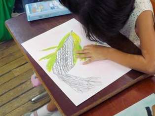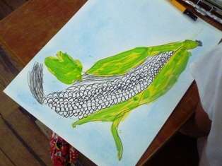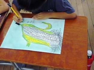 2年生では,春からトウモロコシを育ててきました。夏場,せっかくできてきたトウモロコシの実が,カラスに食べられてしまい,思っていたよりも収穫が少なかったですが,それでも,何本かのトウモロコシができました。夏休みが明け,みんなでその実を取り入れました。そして,図工の時間に,とれたトウモロコシの絵を描きました。絵の具とペンを使って,みんな上手に描くことができました。トウモロコシは,この後の生活の時間で,子どもたちとポップコーンを作ってたべる計画を立てています。