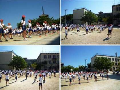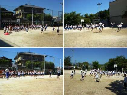 運動会が,あと一週間に迫ってきた今日,1回目の全校練習を行いました。今日の練習は,全校ダンスと応援でした。全校ダンスは,先に中間休みにも練習していましたが,運動場で練習するのは初めて。最初は,少し動きも小さく元気が見られなかったのですが,2回目の練習では,元気いっぱいに動くことができるようになりました。