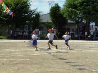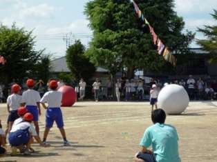 プログラム3番は,縦割り種目の大玉おくりです。赤白の大きな玉を,縦割りグループで力を合わせて押して走ります。低学年の子ども達にとっては,自分の体ほどもある大きな玉。思うように転がらないときもありました。でも,お兄さんお姉さんに助けてもらいながらがんばって走りました。