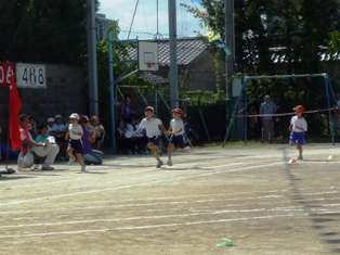 プログラム4番5番は,1年生の50m走と,2年生の80m走です。1年生は,40m先のゴールめざして,直線コースを駆け抜けました。2年生は,コーナーも上手に回って,80mを走りました。