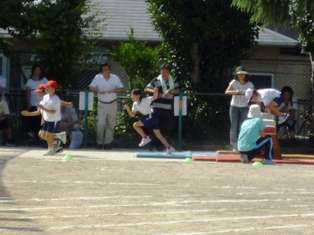 プログラム6番は,3・4年生の障害走,「とんでまわってレッツゴー」です。途中のゴムや輪にひっかかったり,跳び箱の上を乗り越え,最後はボールをかかえながらと,いくつもの障害を乗り越えてゴールに駆け込みました。