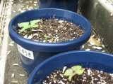 かわいい、小さな、あさがおの芽がでました! まだ、茶色のたねをかぶって 土から...
