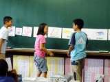 夏休みに頑張って取り組んだ,理科や社会の自由研究の発表会をしました。教室の前に立...
