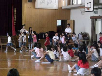 6月1日1校時,1年生をむかえる会を行いました。たてわりグループで体育館に集合した後,1年生の入場を在校生一同で,お迎えをしました。体育館の前から入場し,みんなの前をグルッと一周して,みんなの前に整列しました。