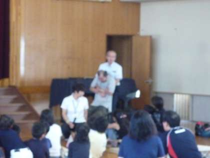 はじめは,親子で,保護者・こどもとともに,けが人を見つけたときや出会ったときの対応の仕方,搬送の仕方,そして,心臓マッサージについて体験を通して教えてもらいました。