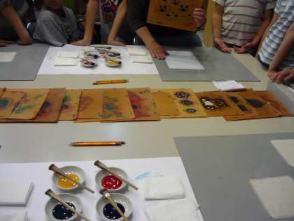 友禅染の取り組み方を説明していただいて,実際に作業開始です。うまくできるかどうか不安な面をもちながらも,少しずつ取り組みはじめました。どんな型紙を使うのか,どんな色をつかおうかなど,工夫をしながら取り組んでいました。