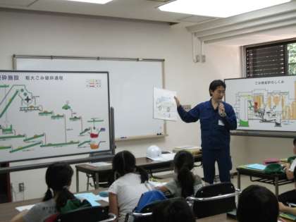 東部クリーンセンターでは,研修室でクリーンセンターの仕組みについて教えていただきました。その後,工場内を見学しました。