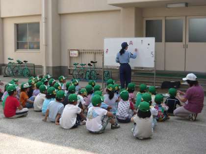 1時間目は,1年生でした。交通ルールについてお話しいただいたあと,横断歩道の渡り方や自転車の基本的な乗り方について実際に活動しながら学習していきました。