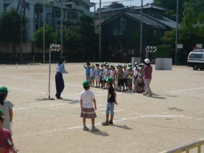 11日(金)夏を思わせるような暑い中でしたが,自転車教室を行うことができました。東山警察署の方が朝休みの時間を活用して,運動場にコースを設定していただきました。