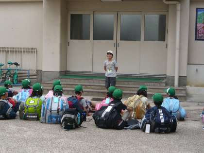 全員体育館前に集合し,出発式です。司会を担当している児童の呼びかけで始まりました。校長先生の話のあと,児童代表の言葉,そして,担任の先生のお話,朝が少し早いこともありますが,静かに落ち着いて出発式を行うことができていました。