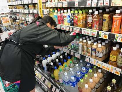 このスーパーでは女子2人が頑張っています。商品チェックをしています。