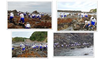 午後の活動は、宮崎浜に磯観察に来ています。やどかりや魚、カニ、ウニなど普段なかなか見ることができない生き物を発見し、ワクワクしています。午後の活動もみんな元気に参加しています。