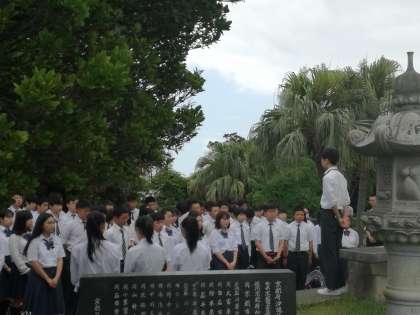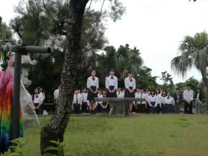嘉数高台公園にある京都の塔で平和セレモニーを行っています。昭和39年に建立され,碑文には「再び戦争の悲しみが繰り返されることのないようまた併せて沖縄と京都とを結ぶ文化と友好との絆がますます固められるようこの塔に切なる願いをよせるものである」と記載されています。