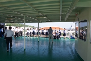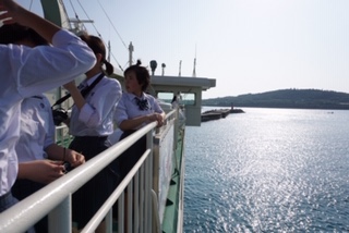 美ら海水族館での活動を終えて、本部港にてフェリーへ乗り込みました。これから伊江島へ向かいます。民家さんとの出会いが楽しみです。