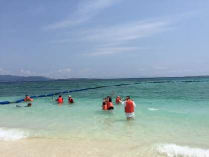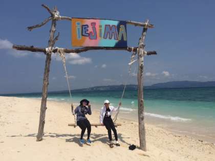 昼からも良い天気です。伊江ビーチに来て素晴らしい七色の海を楽しんでいます。昼からも良い天気です。海以外にも,ビーチのブランコで楽しんでいます!