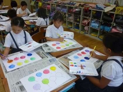 はじめて、個人持ちの絵の具で描く学習をしました。何もかも初めての2年生。道具の名前、筆の使い方、道具のしまい方など、しっかりと先生の説明を聞き、丁寧に進めていく子どもたちの姿がありました。最後は、2色混ぜてつくった色をふうせんのかたちに塗って楽しみました。