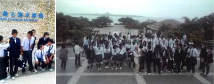 下の画像は,水族館前で撮影した学年写真です。遙か遠くに見える島が,明日の活動場所「伊江島」です。残念ながら,あいにくの曇り空でかすんでしか見えませんが。