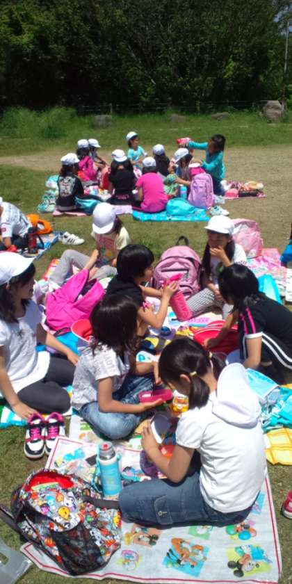 楽しみなお弁当タイムです。絶好の遠足日和の今日。いくつかの他校の子どもたちも遠足を楽しんでいます。太陽のひかりを浴びて、ちょっぴり日に焼けて帰ってくるのではないでしょうか?このあとは元清水小学校の運動場で遊びますよ。お弁当をしっかりいただいて、午後からまた元気に活動してね。