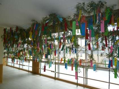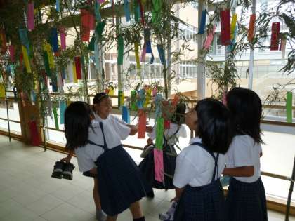 PTAで企画していただいた七夕飾りがきれいに飾り付けられました。先週の金曜日、PTA理事の皆様を中心として、子どもたちが願いを書いた短冊を吊るした学年ごとの笹を、正面玄関にきれいに飾りつけしていただいています。