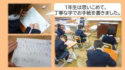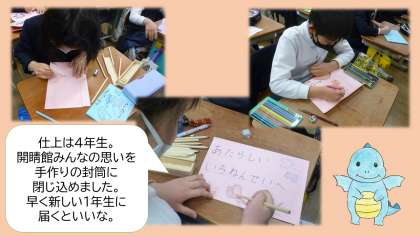 そこで、新しい1年生に「学校って楽しいよ」「友達がいっぱいだよ」「先生はやさしいよ」など学校に来るのを楽しみにしてほしい思いを込めて、みんなでお手紙やお土産をつくりました。