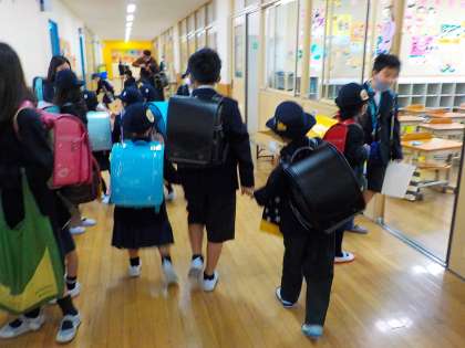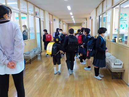 本日,1〜6年生が登校班で各教室に集まって,集団下校をしました。1年生は,入学して3日目での集団下校でした。また,登校班長である4〜6年生も戸惑いを隠せない様子でしたが,登校班クループで力を合わせて頑張っていました。