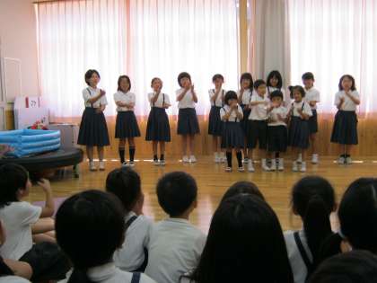 「読み聞かせをしたいな」「手話でコーラスをして、みんなに披露したらどうかな」「係り活動で行っている『お笑い』を紹介したらどうかな」と、子どもたちならではのアイデアが出されました。考え合ったら、すぐ実行に移していく子どもたち。中間休みを利用して、5組の教室やプレイルームに出かけ、1,2年生の子どもたちも一緒にイベント活動を始めました。写真は、手話コーラスを披露し、みんなも一緒に歌っている様子です。そして大型絵本を使っての読み聞かせ。みんなお話の世界に引き込まれているようです。