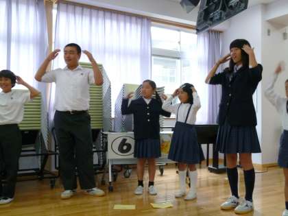 まず、はじめに英語の歌をうたって遊びました。大きな8年生に混じって、うれしそうな3年生。8年生は元気いっぱいに歌って楽しい雰囲気にしてくれます。