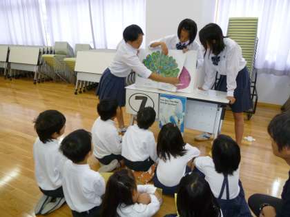 そして、お楽しみの英語による読み聞かせ。8年生の英語学習に対する意欲も感心しますが、3年生に分かりやすいように、「DOGは何かな?」「LUNCHって、聞いたことあるよね」と語りかけてくれる姿にも感心しました。8年生のお兄さん、お姉さんのやさしさに、3年生も英語の学習に興味がわきます。また、すらすら英語を話す8年生を尊敬のまなざしで見つめている3年生でした。