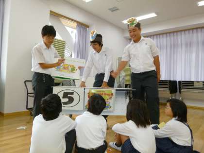 今日の一時間目から、3年生はわくわく。それは、8年生と一緒に英語の学習があるからです。8年生は、英語の授業で大きな絵本を英語で読み聞かせする学習をしてきました。今日は、その英語学習の腕(?)のみせどころ。