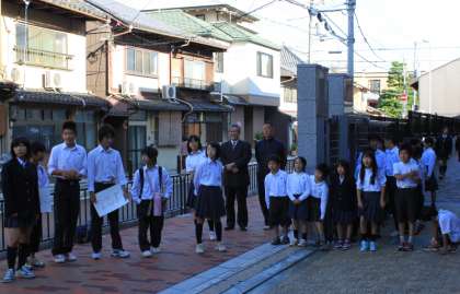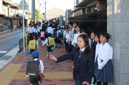 地域のお年寄りも参加していただき,みんな笑顔で登校しています。元気な挨拶は気持ちの良いものですね。