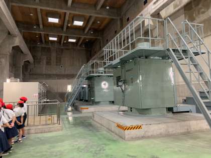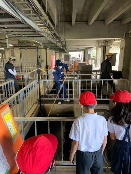 石田水環境保全センターの中を見学させていただいています。環境を守るための仕組みを実際に見せていただき,学んでいます。