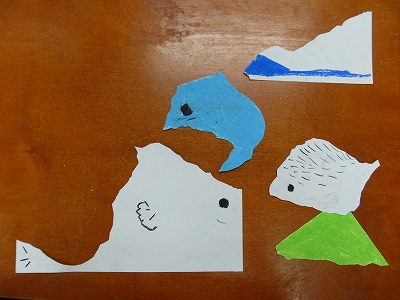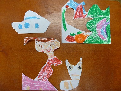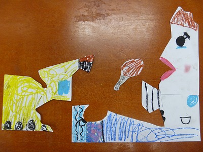 図画工作科「いろいろなかたちのかみから」の学習で,切り取った後の形から,なにに見えるか考えました。向きを変えてみたり,お友達に聞いてみたりして,想像力豊かな作品が出来上がりました。出来上がった作品を見てお友達同士で,「人の横顔だよ。」「これは,遊んでいるハリネズミだよ。」と説明していました。