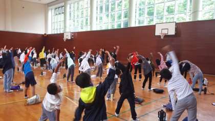 朝は体育館に集まりました。体操をして体を起こします。今日も元気にがんばるぞ。