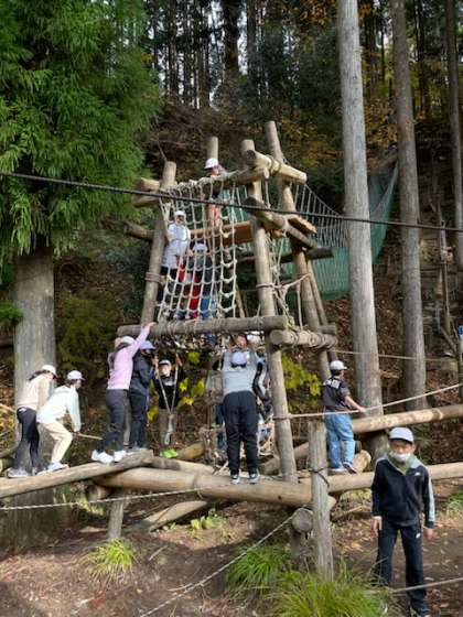 まずは、冒険の森で活動です。山間に作られた本格的なアスレチックです。日頃味わえない、丸太の上を歩いたり、滑車で滑ったり、不安定な吊り橋を渡ったり。がんばれ!もうちょっと引っ張れ!などみんなで声を掛け合いながら楽しんでます。