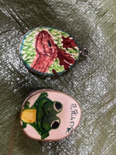 輪切りにした木に絵を描いて、チェーンを付けます。
