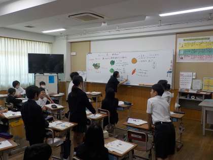 家庭科の授業の様子です。キャベツやブロッコリー、じゃがいもなどの野菜をどのように調理できるか、その方法や料理名を楽しそうに交流していました。毎日いろいろな料理を食べている子どもたち。これからは、それを自分で作れるようになっていきたいですね。5月の後半には調理実習があります。まずは、「ゆでる」ことに挑戦!!