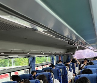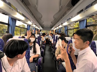 現在レク係が考えてきたバスレクを楽しみながら本部港に向かっています。