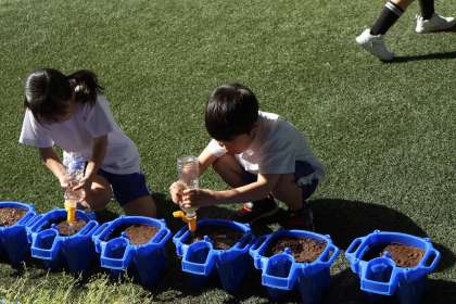 1年生は、生活科であさがおを育てています。芽が早く出てほしい1年生たちは、一生懸命お世話をしています。毎朝、朝の準備を済ますと、ペットボトルに水を入れて、中庭のあさがおに水やりをしています。なかには、「芽が出てた!」「今日は2つも出てた!」と報告してくれる子もいます。