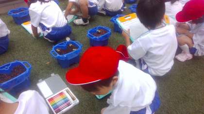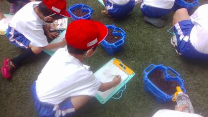 1年生は生活の学習であさがおを育てています。毎日水やりをかかさずしていますが、なかなか芽が出ない子も。「まだ芽が出ない...」と心配になっている子もいました。今日見てみると、たくさんの子の芽が出ていました。ちょうど土からやっと頭を出したようなあさがおの芽もありました。「4つも芽が出てる!!」「昨日は出てなかったのに芽が出たよ!」「1つだと思ったのに、よく見たらもう1つ芽が出てた」「くきのところがあかむらさき色をしてるなぁ」など、あさがおの成長にとても喜ぶ姿がありました。これからもお世話をがんばっていこうね!